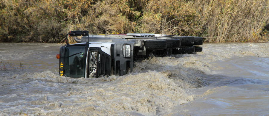 Mercredi matin, chargé de 38 tonnes de bitume à chaud, le camion s’est renversé en passant sur le passage à gué qui relie la route de Caderousse aux entreprises de BTP installées de l’autre côté du cours d’eau, à Piolenc.