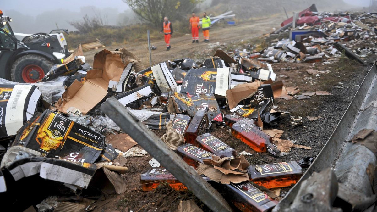 est une « pollution » rare à laquelle il a fallu faire face, sur l’autoroute A75 au sud de l’Aveyron ce jeudi matin. Vers 5h30, dans un brouillard épais, un camion s’est couché sur le bas-côté perdant ainsi une grande partie de son chargement : des bouteilles de Whisky. Certaines se sont cassées sous le choc, déversant l’alcool sur le bas-côté de l’autoroute. D’autres sont restés entières.