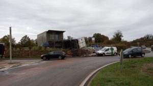 Lundi en fin de journée, peu après 19 heures, le conducteur d’un semi-remorque qui avait fait le plein de son chargement à Béziers a perdu le contrôle au moment de traverser le rond-point de la zone artisanale de Coupille à Livernon. Le camion circulait dans le sens Figeac-Labastide-Murat sur la RD 802. Pour des raisons qui restent à éclaircir, il est allé tout droit : il est d’abord monté sur le terre-plein central avant que sa remorque ne bascule sur le côté droit. Sa course s’est fort heureusement arrêtée à quelques mètres du bâtiment des notaires.