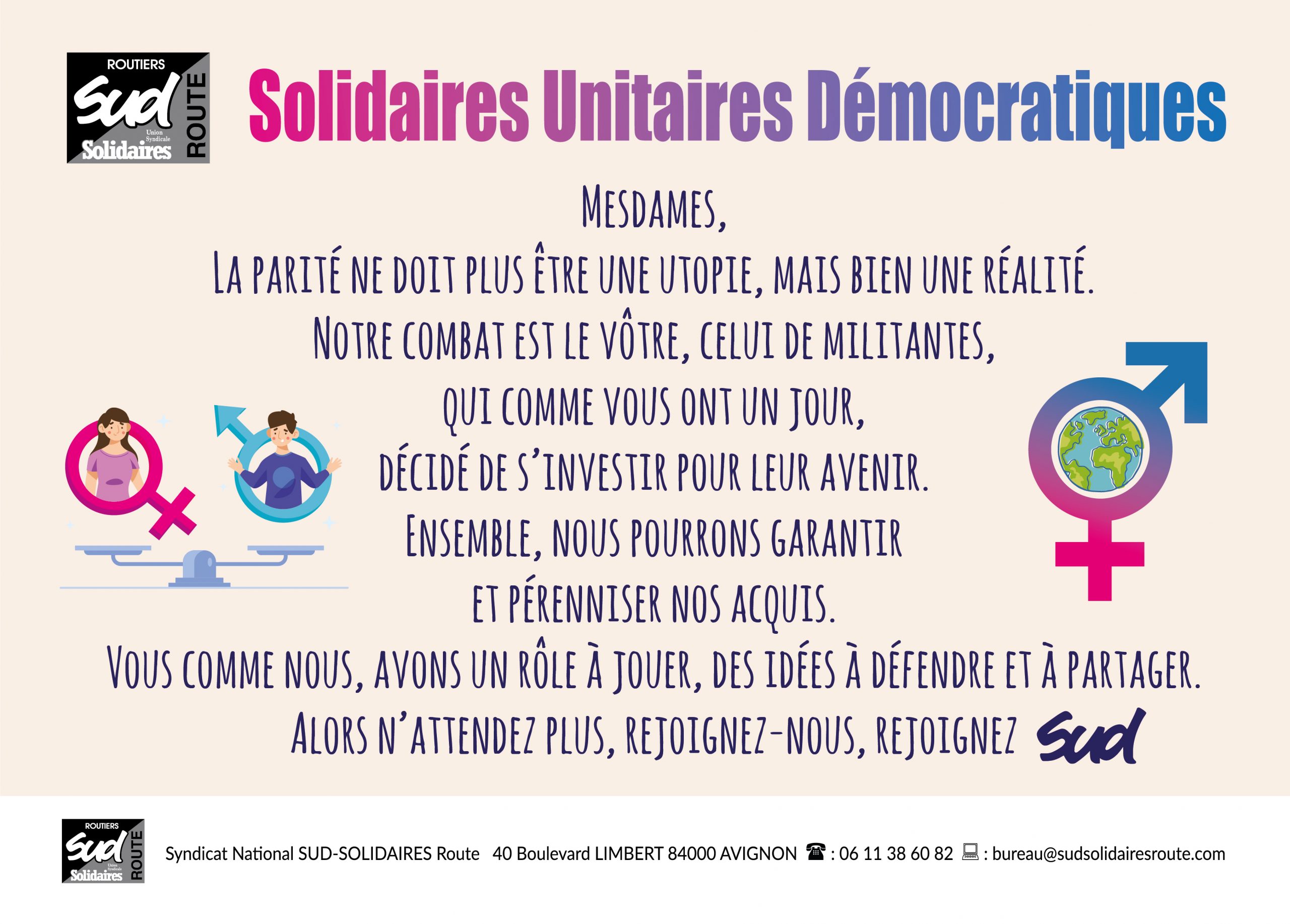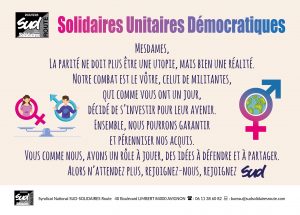 Les élections CSE , ex comité d’entreprise, dans les entreprises continuent alors il est temps de vous investir puisque je rappelle que l’union syndicale SOLIDAIRES fut un des premiers syndicat à prôner l’égalité des sexes au travail .