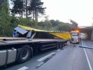 En passant sous un pont de 4 m, son poids lourd s’est retrouvé coincé et la remorque, vide, a fini écrasée sous l’ouvrage, avenue du Connétable à Hérouville-Saint-Clair, sous la 2×2 voies Caen-Ouistreham, vers 20 h 30.